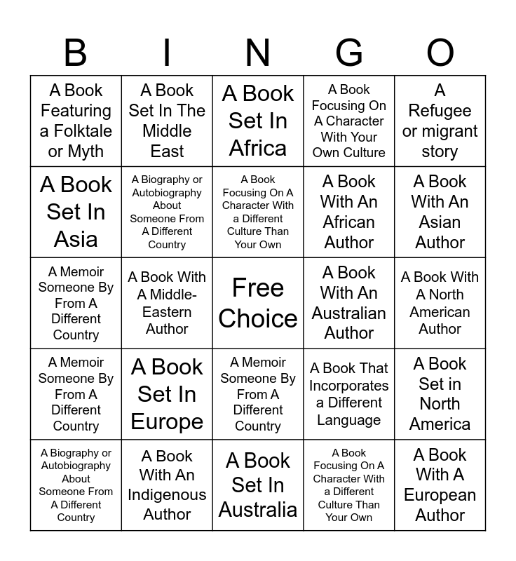This bingo card has a free space and 24 words: A Book Set In Europe, A Book With An Indigenous Author, A Book Focusing On A Character With a Different Culture Than Your Own, A Biography or Autobiography About Someone From A Different Country, A Refugee or migrant story, A Book Featuring a Folktale or Myth, A Book Set In Asia, A Book Set In The Middle East, A Book With An Australian Author, A Memoir Someone By From A Different Country, A Book With An African Author, A Memoir Someone By From A Different Country, A Book That Incorporates a Different Language, A Book Set in North America, A Biography or Autobiography About Someone From A Different Country, A Book Focusing On A Character With a Different Culture Than Your Own, A Book With A North American Author, A Book Set In Africa, A Book With An Asian Author, A Book With A Middle-Eastern Author, A Book With A European Author, A Memoir Someone By From A Different Country, A Book Focusing On A Character With Your Own Culture and A Book Set In Australia.