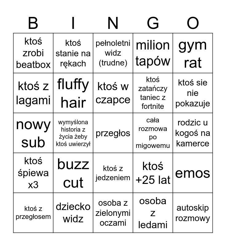 This bingo card has a free space and 24 words: ktoś z przegłosem, buzz cut, ktoś w czapce, osoba z ledami, gym rat, ktoś zrobi beatbox, ktoś stanie na rękach, pełnoletni widz (trudne), cała rozmowa po migowemu, rodzic u kogoś na kamerce, nowy sub, fluffy hair, ktoś +25 lat, emos, ktoś z lagami, dziecko widz, osoba z zielonymi oczami, milion tapów, ktoś sie nie pokazuje, ktoś śpiewa x3, wymyślona historia z życia żeby ktoś uwierzył, ktoś z jedzeniem, ktoś zatańczy taniec z fortnite and autoskip rozmowy.
