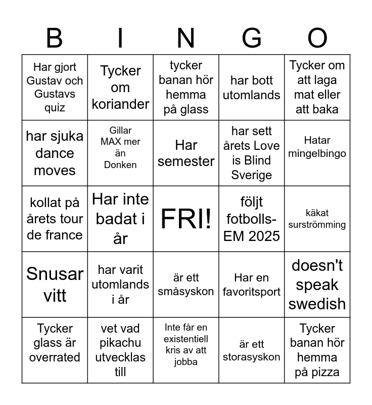This bingo card has a free space and 39 words: Har lyckats hålla en krukväxt vid liv i över ett år, inte är från Skåne, Faktiskt gillar att meditera, Gillar MAX mer än Donken, Tycker glass är overrated, är ett småsyskon, Har semester, snarkar, Tycker om att laga mat eller att baka, Snusar vitt, Har inte badat i år, har bott utomlands, Tycker banan hör hemma på pizza, käkat surströmming, följt fotbolls-EM 2025, har varit utomlands i år, Kan stegra på en cykel, Har gjort Gustav och Gustavs quiz, Tycker om att läsa (få ett boktips), Har en favoritsport, har sjuka dance moves, Inte får en existentiell kris av att jobba, har sett årets Love is Blind Sverige, Hatar mingelbingo, Har en favorit serie (motivera), snusar svart, har ett spirit animal, Vet var den nya påven är ifrån, äger en hawaii-skjorta, Tycker om koriander, Tycker banan hör hemma i en taco, Gillar popcorn mer än chips, tycker banan hör hemma på glass, vet vad pikachu utvecklas till, är ett storasyskon, sjungit i kör, doesn't speak swedish, kollat på årets tour de france and sprang broloppet.