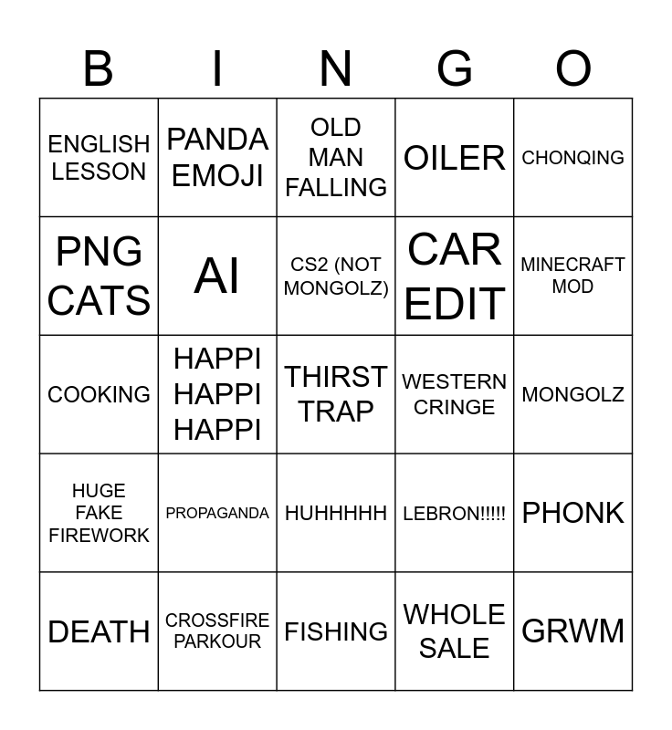 This bingo card has a free space and 24 words: PROPAGANDA, CROSSFIRE PARKOUR, CS2 (NOT MONGOLZ), DEATH, CHONQING, ENGLISH LESSON, PNG CATS, PANDA EMOJI, WESTERN CRINGE, HUHHHHH, CAR EDIT, COOKING, LEBRON!!!!!, PHONK, AI, WHOLE SALE, MONGOLZ, OLD MAN FALLING, MINECRAFT MOD, HAPPI HAPPI HAPPI, GRWM, HUGE FAKE FIREWORK, OILER and FISHING.