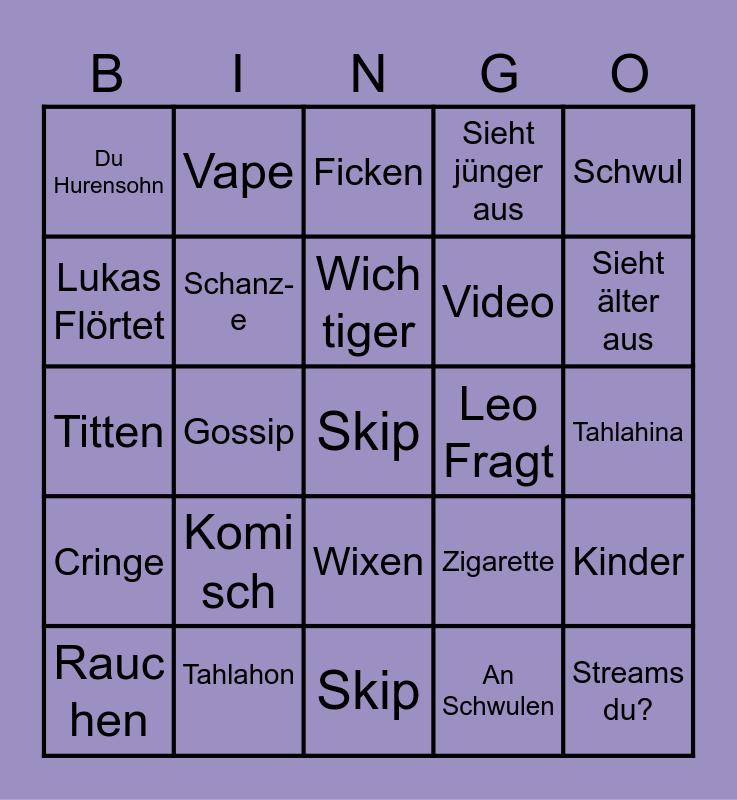 This bingo card has a free space and 24 words: Komi sch, Tahlahon, Wich tiger, Rauc hen, Schwul, Du Hurensohn, Lukas Flörtet, Vape, Leo Fragt, Wixen, Video, Titten, Zigarette, Kinder, Schanz-e, An Schwulen, Tahlahina, Ficken, Sieht älter aus, Gossip, Streams du?, Cringe, Sieht jünger aus and Skip.