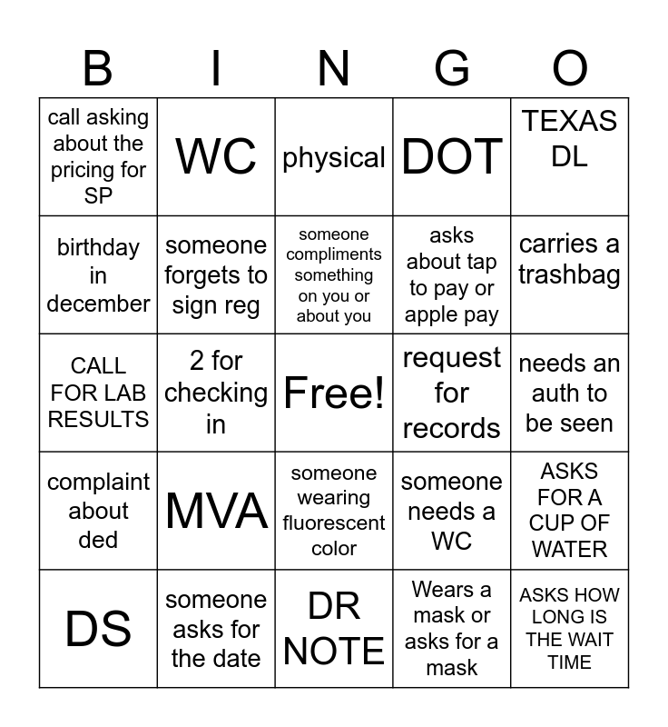This bingo card has a free space and 24 words: MVA, someone asks for the date, someone compliments something on you or about you, DS, TEXAS DL, call asking about the pricing for SP, birthday in december, WC, request for records, someone wearing fluorescent color, asks about tap to pay or apple pay, CALL FOR LAB RESULTS, someone needs a WC, ASKS FOR A CUP OF WATER, someone forgets to sign reg, Wears a mask or asks for a mask, needs an auth to be seen, physical, carries a trashbag, 2 for checking in, ASKS HOW LONG IS THE WAIT TIME, complaint about ded, DOT and DR NOTE.