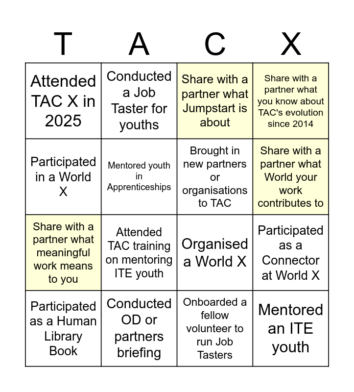 This bingo card has 16 words: Conducted OD or partners briefing, Participated as a Connector at World X, Share with a partner what Jumpstart is about, Attended TAC X in 2025, Share with a partner what meaningful work means to you, Conducted a Job Taster for youths, Organised a World X, Onboarded a fellow volunteer to run Job Tasters, Participated in a World X, Mentored youth in Apprenticeships, Participated as a Human Library Book, Share with a partner what you know about TAC's evolution since 2014, Attended TAC training on mentoring ITE youth, Share with a partner what World your work contributes to, Brought in new partners or organisations to TAC and Mentored an ITE youth.