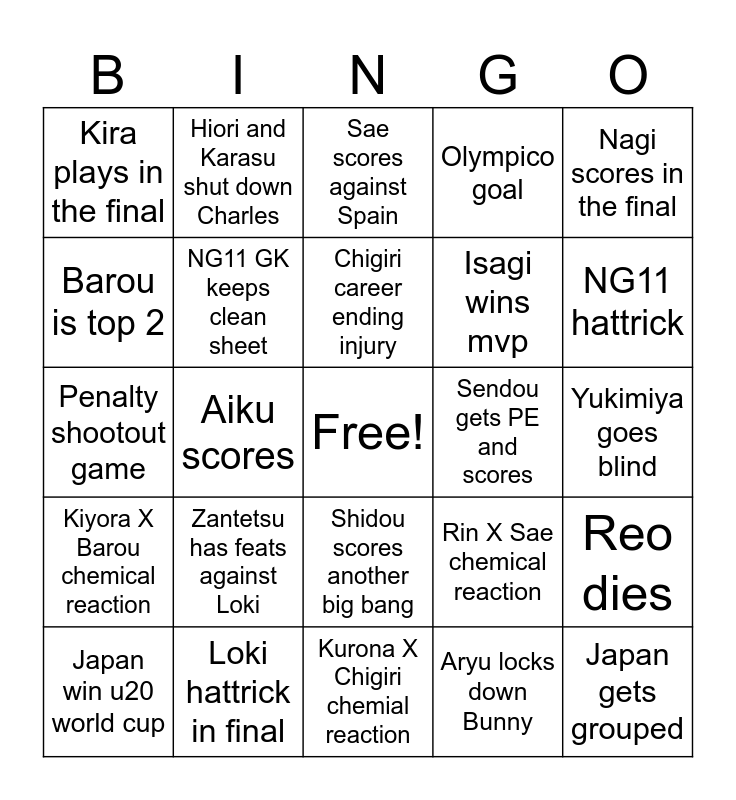 This bingo card has a free space and 24 words: Japan win u20 world cup, Zantetsu has feats against Loki, Chigiri career ending injury, Aryu locks down Bunny, Nagi scores in the final, Kira plays in the final, Hiori and Karasu shut down Charles, Sae scores against Spain, Sendou gets PE and scores, Yukimiya goes blind, Penalty shootout game, NG11 GK keeps clean sheet, Rin X Sae chemical reaction, Reo dies, Barou is top 2, Loki hattrick in final, Kurona X Chigiri chemial reaction, Olympico goal, NG11 hattrick, Kiyora X Barou chemical reaction, Aiku scores, Shidou scores another big bang, Isagi wins mvp and Japan gets grouped.