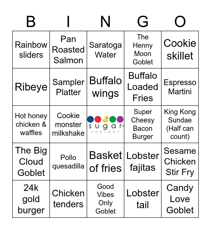 This bingo card has a free space and 24 words: Pollo quesadilla, Chicken tenders, Buffalo wings, 24k gold burger, Cookie skillet, Rainbow sliders, Ribeye, Pan Roasted Salmon, Super Cheesy Bacon Burger, Basket of fries, Buffalo Loaded Fries, Hot honey chicken & waffles, Lobster fajitas, Sesame Chicken Stir Fry, Sampler Platter, Lobster tail, King Kong Sundae (Half can count), Saratoga Water, Espresso Martini, Cookie monster milkshake, Candy Love Goblet, The Big Cloud Goblet, The Henny Moon Goblet and Good Vibes Only Goblet.