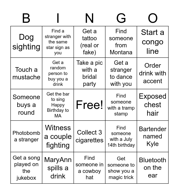 This bingo card has a free space and 41 words: FREE SPACE (Cheers!), Someone buys a round, Someone in the group cries (happy or drunk), Get a random person to buy you a drink, MaryAnn spills a drink, Collect 3 cigarettes, Take a pic with a bridal party, Take mystery shot - bartender choice, Start a congo line, Photobomb a stranger, Get the bar to sing Happy Birthday to MA, Find someone from Montana, Bluetooth on the ear, Exposed chest hair, Find someone with a tramp stamp, Witness a couple fighting, Take a selfie with a bartender, Dog sighting, Find a woman in cheetah print, Get a tattoo (real or fake), Bartender named Kyle, Gabby orders potatoes, Find someone in a cowboy hat, Get a stranger to dance with you, Arm wrestle a stranger, Collect a lemon, lime, and orange slice SEPARATELY, Get someone to show you a magic trick, Take a shot with no hands, Order drink with accent, Drink some water, See a couple making out, Find a stranger with the same star sign as you, Get a song played on the jukebox, Stand up and make a toast, Find someone with a July 14th birthday, Touch a mustache, Find someone named Jessica, Swap an item of clothing with someone, Find a neon sign, Find someone with blue hair and 41..