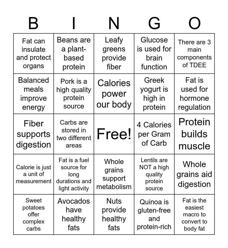 This bingo card has a free space and 36 words: Protein has 4 calories per Gram, Protein builds muscle, Excess protein doesn’t get stored like carbs/fats, Pork is a high quality protein source, Lentils are NOT a high quality protein source, Calorie is just a unit of measurement, Calories power our body, BMR is the energy needed to survive, There are 3 main components of TDEE, Carbs are our main source of energy, Carbs are stored in two different areas, Glucose is used for brain function, Carbs enhance anaerobic activities, 4 Calories per Gram of Carb, Fat is used for hormone regulation, Fat can insulate and protect organs, There are 9 Cals per Gram of fat, Fat is a fuel source for long durations and light activity, Fat is the easiest macro to convert to body fat, Leafy greens provide fiber, Protein builds muscle, Whole grains aid digestion, Avocados have healthy fats, Sweet potatoes offer complex carbs, Nuts provide healthy fats, Beans are a plant-based protein, Fiber supports digestion, Eggs contain essential amino acids, Greek yogurt is high in protein, Balanced meals improve energy, Brown rice has complex carbs, Lentils provide plant protein, Quinoa is gluten-free and protein-rich, Whole grains support metabolism, Whole grains aid bowel regularity and Plain popcorn offers fiber.