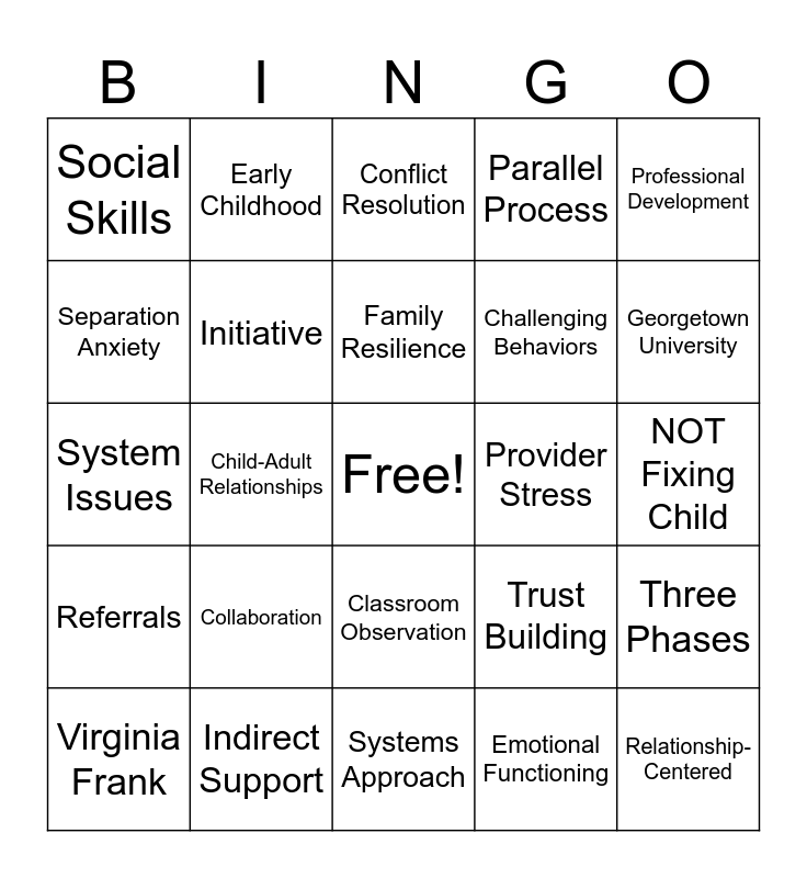 This bingo card has a free space and 48 words: Prevention-Based, Relationship-Centered, Capacity Building, Systems Approach, Collaboration, Mental Health, Early Childhood, Attachment, Separation Anxiety, Autonomy, Initiative, Parallel Process, Three Phases, Trust Building, Site Culture, Behavioral Support, Family Resilience, Provider Stress, Staff Burnout, Professional Development, Child-Adult Relationships, Emotional Functioning, Social Skills, Challenging Behaviors, Consultation, Georgetown University, Virginia Frank, JCFS Chicago, Classroom Observation, Referrals, Head Start, Preschool, Home Visiting, Big Picture Thinking, Indirect Support, NOT Therapy, NOT Supervision, NOT Fixing Child, Developmental Phases, End of Year, Mid-Year, First 3 Months, Conflict Resolution, Transition Planning, System Issues, Whole Organization, Timing Matters and 22,000 Families.