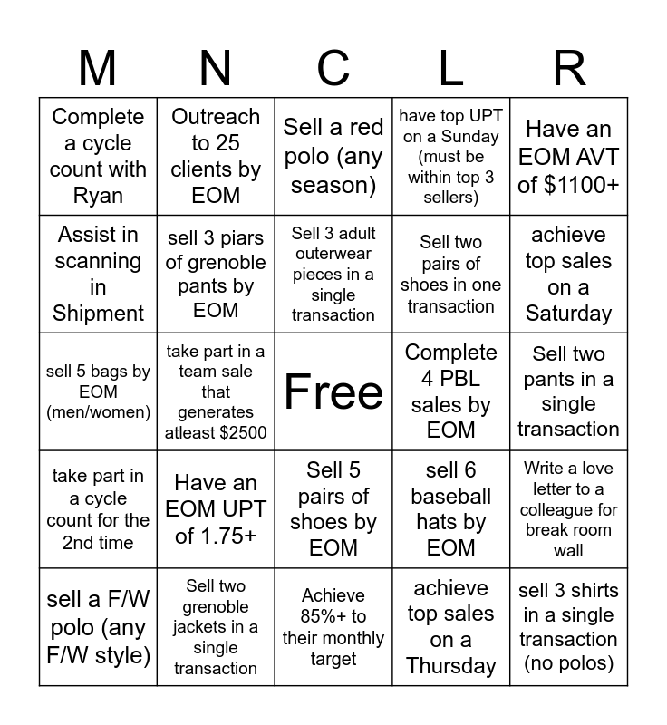 This bingo card has a free space and 24 words: Have an EOM UPT of 1.75+, Sell two grenoble jackets in a single transaction, Sell 3 adult outerwear pieces in a single transaction, sell a F/W polo (any F/W style), Have an EOM AVT of $1100+, Complete a cycle count with Ryan, Assist in scanning in Shipment, Outreach to 25 clients by EOM, Complete 4 PBL sales by EOM, Sell 5 pairs of shoes by EOM, Sell two pairs of shoes in one transaction, sell 5 bags by EOM (men/women), sell 6 baseball hats by EOM, Write a love letter to a colleague for break room wall, sell 3 piars of grenoble pants by EOM, achieve top sales on a Thursday, Sell two pants in a single transaction, Sell a red polo (any season), achieve top sales on a Saturday, take part in a team sale that generates atleast $2500, sell 3 shirts in a single transaction (no polos), take part in a cycle count for the 2nd time, have top UPT on a Sunday (must be within top 3 sellers) and Achieve 85%+ to their monthly target.