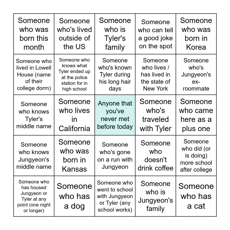 This bingo card has a free space and 24 words: Someone who was born in Kansas, Someone who has a dog, Someone who's known Tyler during his long hair days, Someone who has housed Jungyeon or Tyler at any point (one night or longer), Someone who was born in Korea, Someone who was born this month, Someone who lived in Lowell House (name of their college dorm), Someone who's lived outside of the US, Someone who's traveled with Tyler, Someone who's gone on a run with Jungyeon, Someone who lives / has lived in the state of New York, Someone who knows Tyler's middle name, Someone who doesn't drink coffee, Someone who did (or is doing) more school after college, Someone who knows what Tyler ended up at the police station for in high school, Someone who is Jungyeon's family, Someone who came here as a plus one, Someone who is Tyler's family, Someone who's Jungyeon's ex-roommate, Someone who lives in California, Someone who has a cat, Someone who knows Jungyeon's middle name, Someone who can tell a good joke on the spot and Someone who went to school with Jungyeon or Tyler (any school works).