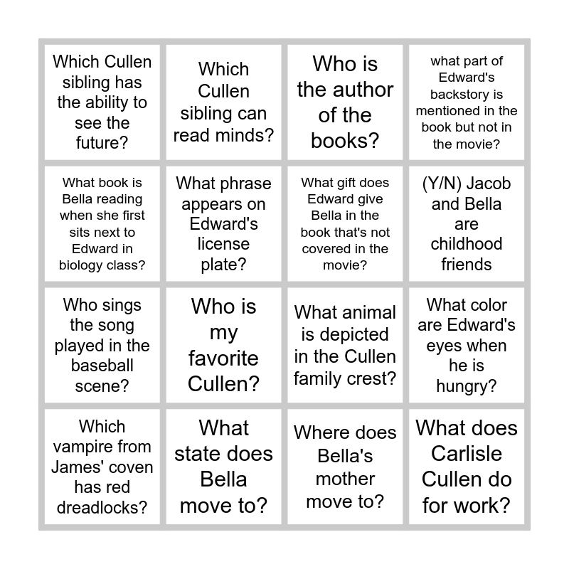 This bingo card has 16 words: What state does Bella move to?, What color are Edward's eyes when he is hungry?, Who is the author of the books?, Which Cullen sibling has the ability to see the future?, Who sings the song played in the baseball scene?, Which Cullen sibling can read minds?, What animal is depicted in the Cullen family crest?, Where does Bella's mother move to?, What book is Bella reading when she first sits next to Edward in biology class?, What phrase appears on Edward's license plate?, Which vampire from James' coven has red dreadlocks?, what part of Edward's backstory is mentioned in the book but not in the movie?, Who is my favorite Cullen?, (Y/N) Jacob and Bella are childhood friends, What gift does Edward give Bella in the book that's not covered in the movie? and What does Carlisle Cullen do for work?.