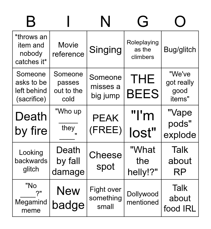 This bingo card has a free space and 37 words: "I like my sootcase", "Pitón~", Someone dies at The Kiln, Someone passes out to the cold, Talk about RP, Death by fall damage, Someone misses a big jump, Someone leaves everyone behind, Bug/glitch, Wicked song #shorts reference, "Who up _____ they ____", Roleplaying as the climbers, Talk about food IRL, "Vape pods" explode, Someone asks to be left behind (sacrifice), Looking backwards glitch, They reach the PEAK!, Singing, Cheese spot, "I'm lost", *throws an item and nobody catches it*, "We've got really good items", "No ____?" Megamind meme, Fight over something small, Impression, Dollywood mentioned, Movie reference, Non-american accent (usually british), "Poison~" (low pitched), Bad mushroom eaten, Ambitious climb gone wrong, New badge, Death by fire, French word, "What the helly!?", THE BEES and Cannibalism.