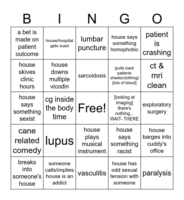 This bingo card has a free space and 25 words: lupus, vasculitis, sarcoidosis, breaks into someone's house, patient is crashing, a bet is made on patient outcome, house skives clinic hours, house/hospital gets sued, [looking at imaging] there's nothing... WAIT- THERE, house plays musical instrument, [pulls back patients sheets/clothing] [lots of blood], house says something sexist, house says something racist, house barges into cuddy's office, house downs multiple vicodin, drills into head, exploratory surgery, lumbar puncture, ct & mri clean, cg inside the body time, paralysis, someone calls/implies house is an addict, cane related comedy, house says something homophobic and house has odd sexual tension with someone.
