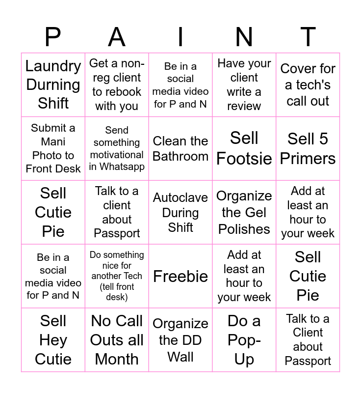 This bingo card has 26 words: Freebie, Do a Pop-Up, Clean the Bathroom, No Call Outs all Month, Cover for a tech's call out, Laundry Durning Shift, Submit a Mani Photo to Front Desk, Get a non-reg client to rebook with you, Add at least an hour to your week, Add at least an hour to your week, Sell Footsie, Sell Cutie Pie, Sell Cutie Pie, Sell Hey Cutie, Talk to a client about Passport, Have your client write a review, Have your client write a review, Be in a social media video for P and N, Be in a social media video for P and N, Autoclave During Shift, Sell 5 Primers, Organize the DD Wall, Organize the Gel Polishes, Do something nice for another Tech (tell front desk), Send something motivational in Whatsapp and Talk to a Client about Passport.