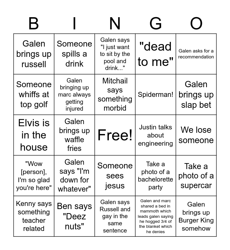 This bingo card has a free space and 24 words: Galen says "I'm down for whatever", Ben says "Deez nuts", Mitchail says something morbid, Kenny says something teacher related, Galen asks for a recommendation, Galen brings up russell, Someone whiffs at top golf, Someone spills a drink, Justin talks about engineering, Someone sees jesus, Spiderman!, Elvis is in the house, Take a photo of a bachelorette party, Take a photo of a supercar, Galen bringing up marc always getting injured, Galen and marc shared a bed in mammoth which leads galen saying he hogged 3/4 of the blanket which he denies, We lose someone, Galen says "I just want to sit by the pool and drink...", Galen brings up slap bet, Galen brings up waffle fries, Galen brings up Burger King somehow, "Wow [person], I'm so glad you're here", "dead to me" and Galen says Russell and gay in the same sentence.