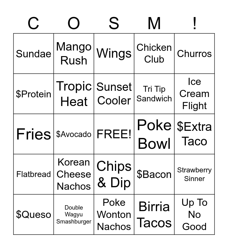 This bingo card has a free space and 24 words: Korean Cheese Nachos, Double Wagyu Smashburger, Sunset Cooler, $Queso, Churros, Sundae, $Protein, Mango Rush, Poke Bowl, Chips & Dip, Tri Tip Sandwich, Fries, $Bacon, Strawberry Sinner, Tropic Heat, Birria Tacos, $Extra Taco, Wings, Ice Cream Flight, $Avocado, Up To No Good, Flatbread, Chicken Club and Poke Wonton Nachos.