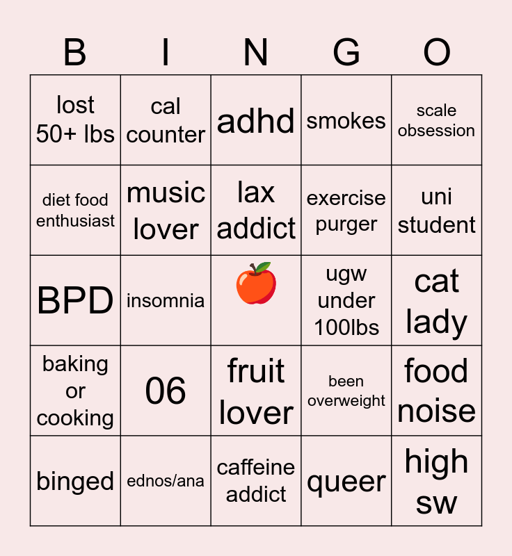 This bingo card has a free space and 24 words: 06, ednos/ana, lax addict, binged, scale obsession, lost 50+ lbs, diet food enthusiast, cal counter, ugw under 100lbs, fruit lover, exercise purger, BPD, been overweight, food noise, music lover, queer, cat lady, adhd, uni student, insomnia, high sw, baking or cooking, smokes and caffeine addict.