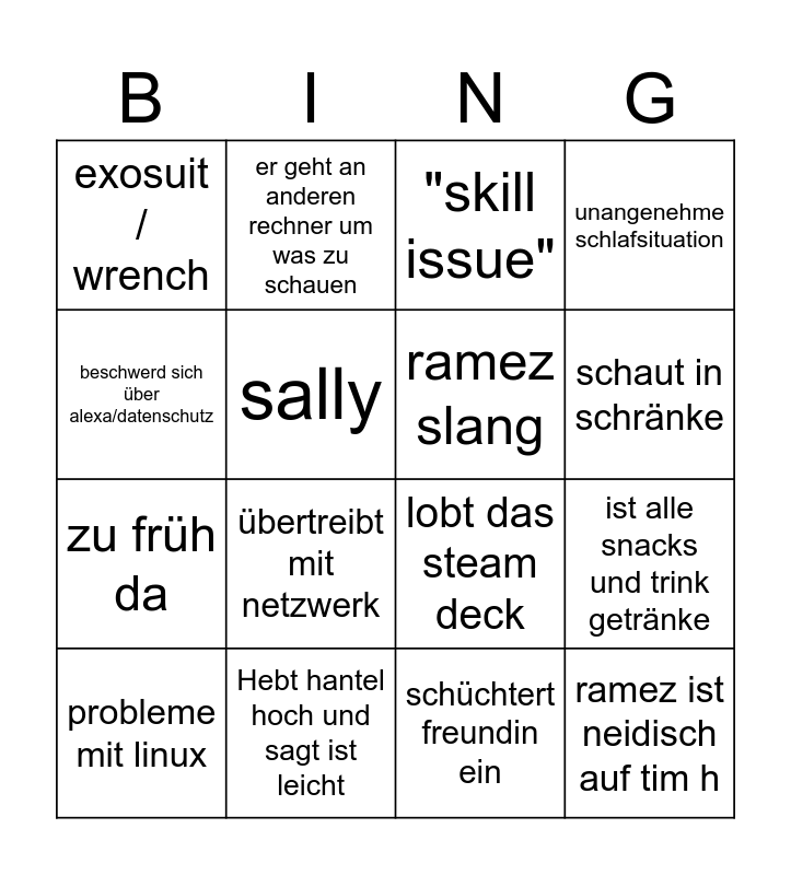 This bingo card has 16 words: Hebt hantel hoch und sagt ist leicht, ist alle snacks und trink getränke, "skill issue", exosuit / wrench, zu früh da, er geht an anderen rechner um was zu schauen, lobt das steam deck, schüchtert freundin ein, beschwerd sich über alexa/datenschutz, sally, probleme mit linux, unangenehme schlafsituation, übertreibt mit netzwerk, schaut in schränke, ramez slang and ramez ist neidisch auf tim h.