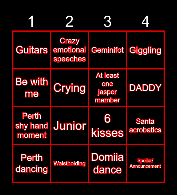This bingo card has 16 words: Waistholding, Santa acrobatics, Geminifot, Guitars, Perth shy hand moment, Crazy emotional speeches, 6 kisses, Domiia dance, Be with me, Crying, Perth dancing, Giggling, Junior, DADDY, At least one jasper member and Spoiler/ Announcement.