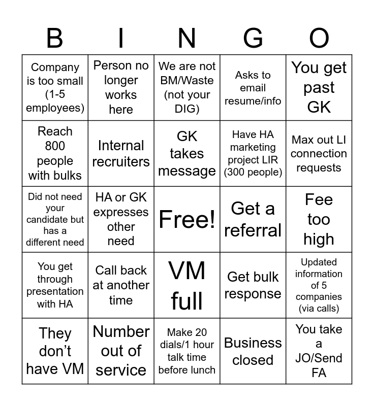 This bingo card has a free space and 39 words: Funny response when GK transfers to HA (Ex. HA answers Dominos pizza and hangs up”), We are not hiring, We don’t use recruiters, Internal recruiters, They don’t have VM, VM full, GK takes message, GK hangs up, You get past GK, You get through presentation with HA, HA or GK expresses other need, Asks to email resume/info, You take a JO/Send FA, Fee too high, Get a referral, Call back at another time, Downsizing/Hiring freeze, Company is too small (1-5 employees), Asks about fee before you get to present candidate, Get bulk response, Reach 800 people with bulks, Make 20 dials/1 hour talk time before lunch, Have HA marketing project LIR (300 people), Max out LI connection requests, Leave 20 VM (1 day), Talk to 20 live people (1 day), Have 5 people hang up, Collect 50 Nos, Re-engage orphan company, Person no longer works here, Wrong number, That person is deceased, We are not BM/Waste (not your DIG), Number out of service, Business closed, Company gave us JO in past but never signed (get on phone), Updated information of 5 companies (via calls), Did not need your candidate but has a different need and You get a CDS of the GK or HA.