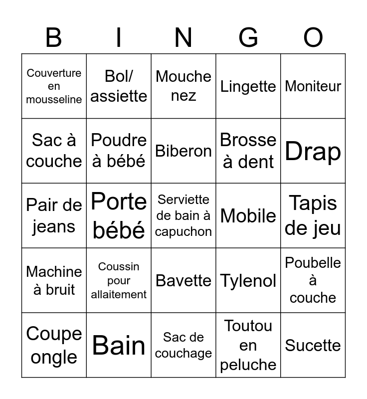 This bingo card has 35 words: Bateau, Hochet, Parc, Poudre ร bรฉbรฉ, Bavette, Lingette, Sac ร couche, Peigne/ brosse ร cheveux, Biberon, Thermomรจtre pour le bain, Pair de jeans, Moniteur, Tire lait, Couvre matelas, Couverture en mousseline, Mobile, Toutou en peluche, Porte bรฉbรฉ, Machine ร bruit, Serviette de bain ร capuchon, Tylenol, Coupe ongle, Poubelle ร couche, Bain, Mouche nez, Drap, Sucette, Couche, Brosse ร dent, Tapis de jeu, Bas, Sac de couchage, Coussin pour allaitement, Bol/ assiette and Camion.