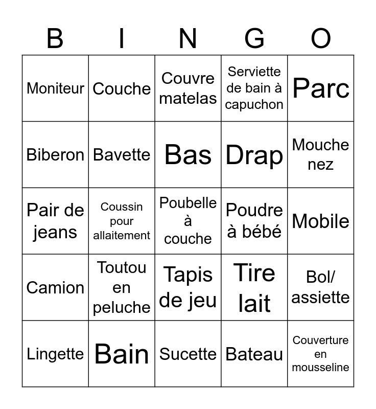 This bingo card has 35 words: Brosse ร dent, Machine ร bruit, Thermomรจtre pour le bain, Bavette, Tapis de jeu, Serviette de bain ร capuchon, Biberon, Hochet, Bas, Tylenol, Pair de jeans, Parc, Sac de couchage, Coupe ongle, Moniteur, Poudre ร bรฉbรฉ, Bateau, Coussin pour allaitement, Camion, Poubelle ร couche, Tire lait, Lingette, Bol/ assiette, Bain, Couvre matelas, Mouche nez, Couverture en mousseline, Sac ร couche, Drap, Mobile, Peigne/ brosse ร cheveux, Sucette, Toutou en peluche, Couche and Porte bรฉbรฉ.