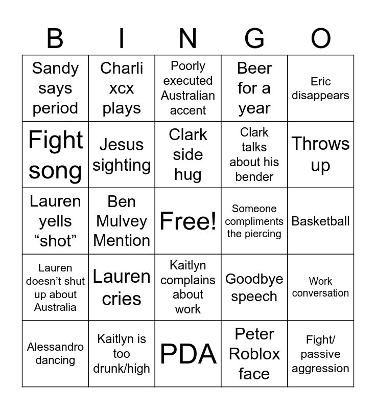 This bingo card has a free space and 24 words: Lauren cries, Kaitlyn is too drunk/high, Clark side hug, Alessandro dancing, Eric disappears, Sandy says period, Fight song, Charli xcx plays, Someone compliments the piercing, Kaitlyn complains about work, Clark talks about his bender, Lauren yells “shot”, Goodbye speech, Work conversation, Jesus sighting, Peter Roblox face, Basketball, Poorly executed Australian accent, Throws up, Ben Mulvey Mention, Fight/ passive aggression, Lauren doesn’t shut up about Australia, Beer for a year and PDA.