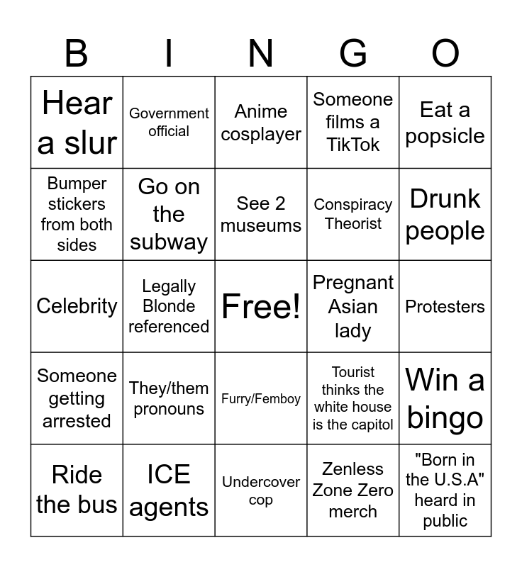 This bingo card has a free space and 24 words: They/them pronouns, ICE agents, See 2 museums, Ride the bus, Eat a popsicle, Hear a slur, Bumper stickers from both sides, Government official, Pregnant Asian lady, Furry/Femboy, Conspiracy Theorist, Celebrity, Tourist thinks the white house is the capitol, Win a bingo, Go on the subway, Zenless Zone Zero merch, Protesters, Anime cosplayer, Drunk people, Legally Blonde referenced, "Born in the U.S.A" heard in public, Someone getting arrested, Someone films a TikTok and Undercover cop.
