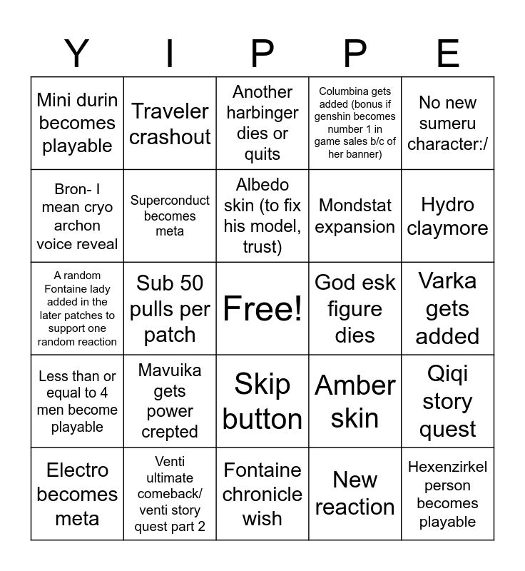 This bingo card has a free space and 24 words: Mavuika gets power crepted, Venti ultimate comeback/ venti story quest part 2, Albedo skin (to fix his model, trust), Electro becomes meta, No new sumeru character:/, Mini durin becomes playable, Bron- I mean cryo archon voice reveal, Traveler crashout, God esk figure dies, Skip button, Mondstat expansion, A random Fontaine lady added in the later patches to support one random reaction, Amber skin, Qiqi story quest, Superconduct becomes meta, New reaction, Varka gets added, Another harbinger dies or quits, Hydro claymore, Sub 50 pulls per patch, Hexenzirkel person becomes playable, Less than or equal to 4 men become playable, Columbina gets added (bonus if genshin becomes number 1 in game sales b/c of her banner) and Fontaine chronicle wish.
