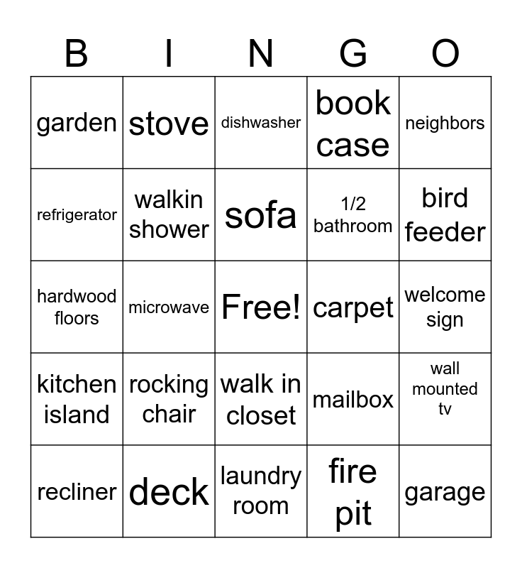 This bingo card has a free space and 24 words: rocking chair, deck, sofa, recliner, neighbors, garden, refrigerator, stove, carpet, walk in closet, 1/2 bathroom, hardwood floors, mailbox, wall mounted tv, walkin shower, fire pit, welcome sign, dishwasher, bird feeder, microwave, garage, kitchen island, book case and laundry room.