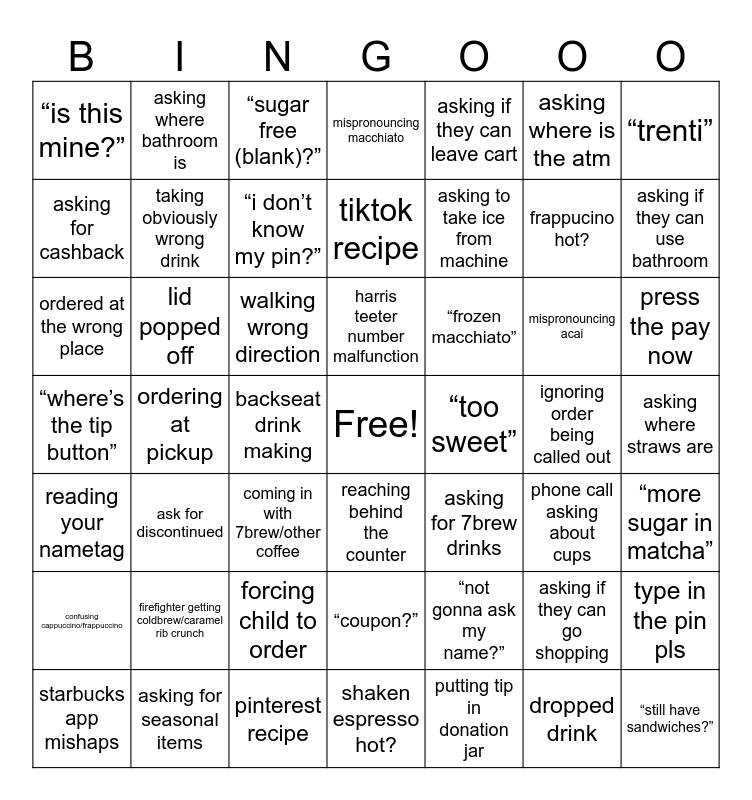 This bingo card has a free space and 48 words: “not gonna ask my name?”, frappucino hot?, shaken espresso hot?, ordering at pickup, walking wrong direction, asking where straws are, asking where bathroom is, asking for seasonal items, asking where is the atm, reaching behind the counter, “trenti”, mispronouncing macchiato, mispronouncing acai, “frozen macchiato”, confusing cappuccino/frappuccino, ignoring order being called out, asking for cashback, asking if they can use bathroom, asking if they can go shopping, asking if they can leave cart, asking to take ice from machine, backseat drink making, “is this mine?”, taking obviously wrong drink, type in the pin pls, “i don’t know my pin?”, press the pay now, starbucks app mishaps, harris teeter number malfunction, lid popped off, dropped drink, “too sweet”, “more sugar in matcha”, firefighter getting coldbrew/caramel rib crunch, “where’s the tip button”, asking for 7brew drinks, phone call asking about cups, ordered at the wrong place, coming in with 7brew/other coffee, forcing child to order, reading your nametag, “still have sandwiches?”, “sugar free (blank)?”, pinterest recipe, tiktok recipe, “coupon?”, ask for discontinued and putting tip in donation jar.