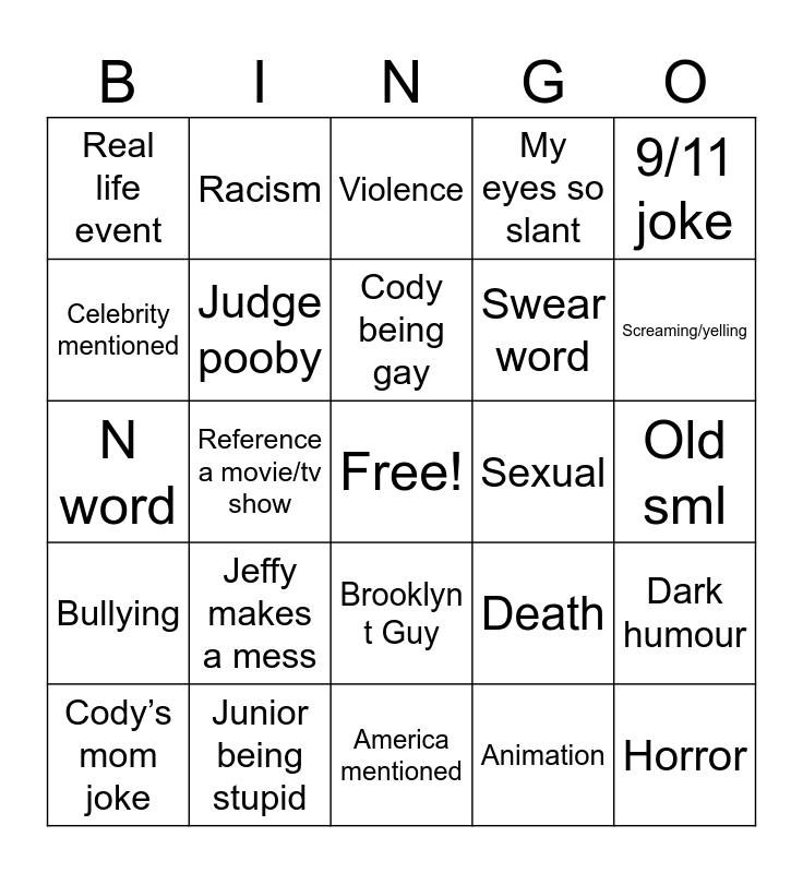 This bingo card has a free space and 24 words: Jeffy makes a mess, Junior being stupid, Cody being gay, Cody’s mom joke, 9/11 joke, Real life event, Celebrity mentioned, Racism, Sexual, Brooklyn t Guy, Swear word, N word, Death, Dark humour, Judge pooby, Animation, Old sml, Violence, Screaming/yelling, Reference a movie/tv show, Horror, Bullying, My eyes so slant and America mentioned.