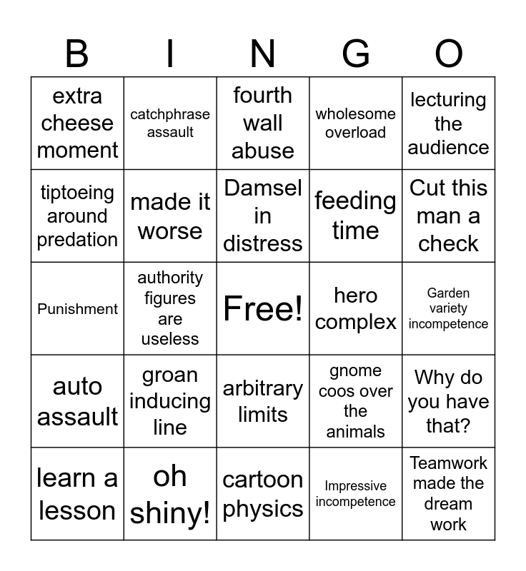 This bingo card has a free space and 27 words: gnome coos over the animals, babies!, feeding time, cartoon physics, tiptoeing around predation, fourth wall abuse, catchphrase assault, auto assault, hero complex, Why do you have that?, Punishment, wholesome overload, learn a lesson, oh shiny!, Cut this man a check, this was your fault, made it worse, Damsel in distress, groan inducing line, extra cheese moment, Garden variety incompetence, Impressive incompetence, authority figures are useless, Teamwork made the dream work, arbitrary limits, lecturing the audience and lecturing the team.