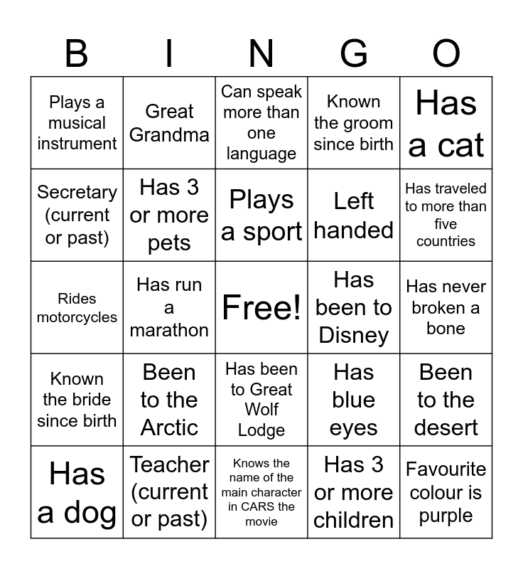 This bingo card has a free space and 24 words: Been to the Arctic, Teacher (current or past), Plays a sport, Has a dog, Has a cat, Plays a musical instrument, Secretary (current or past), Great Grandma, Has been to Disney, Has been to Great Wolf Lodge, Left handed, Rides motorcycles, Has blue eyes, Been to the desert, Has 3 or more pets, Has 3 or more children, Has never broken a bone, Can speak more than one language, Has traveled to more than five countries, Has run a marathon, Favourite colour is purple, Known the bride since birth, Known the groom since birth and Knows the name of the main character in CARS the movie.