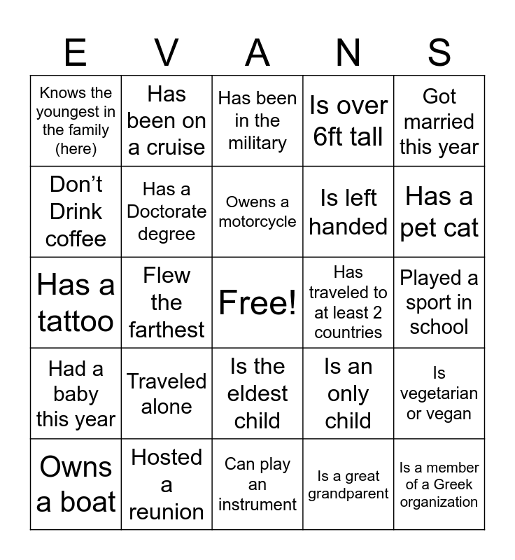 This bingo card has a free space and 30 words: Hosted a reunion, Drove the farthest, Flew the farthest, Knows the oldest in the family (here), Knows the youngest in the family (here), Has been in the military, Has a Doctorate degree, Is the eldest child, Has traveled to at least 2 countries, Can play an instrument, Played a sport in school, Is a member of a Greek organization, Is a great grandparent, Is a grandparent, Has a pet cat, Has a pet dog, Is an only child, Had a baby this year, Traveled alone, Got married this year, Has a tattoo, Has a $20 bill in wallet, Has been on a cruise, Is left handed, Don’t Drink coffee, Is over 6ft tall, Is vegetarian or vegan, Owns a boat, Owens a motorcycle and Relocated to another state this year.
