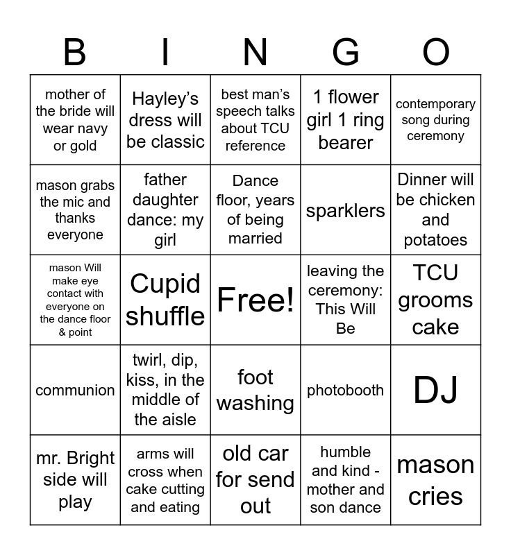 This bingo card has a free space and 29 words: mr. Bright side will play, cocktail hour will be less than an hour, Cupid shuffle, dancing queen, mother of the bride will wear navy or gold, best man’s speech talks about TCU reference, father daughter dance: my girl, twirl, dip, kiss, in the middle of the aisle, leaving the ceremony: This Will Be, arms will cross when cake cutting and eating, TCU grooms cake, mason cries, old car for send out, humble and kind - mother and son dance, Dinner will be chicken and potatoes, morgan Crashes the wedding, foot washing, communion, contemporary song during ceremony, mason Will make eye contact with everyone on the dance floor & point, photobooth, Hayley changes dress for reception, sparklers, mason grabs the mic and thanks everyone, 1 flower girl 1 ring bearer, Hayley’s dress will be classic, DJ, Dance floor, years of being married and No garter toss.