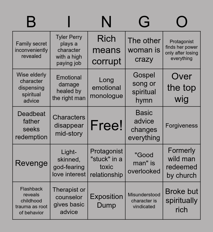 This bingo card has a free space and 24 words: Light-skinned, god-fearing love interest, Therapist or counselor gives basic advice, Long emotional monologue, Flashback reveals childhood trauma as root of behavior, Protagonist finds her power only after losing everything, Family secret inconveniently revealed, Wise elderly character dispensing spiritual advice, Tyler Perry plays a character with a high paying job, Basic advice changes everything, Protagonist "stuck" in a toxic relationship, Gospel song or spiritual hymn, Deadbeat father seeks redemption, "Good man" is overlooked, Formerly wild man redeemed by church, Emotional damage healed by the right man, Misunderstood character is vindicated, Forgiveness, Rich means corrupt, Over the top wig, Characters disappear mid-story, Broke but spiritually rich, Revenge, The other woman is crazy and Exposition Dump.