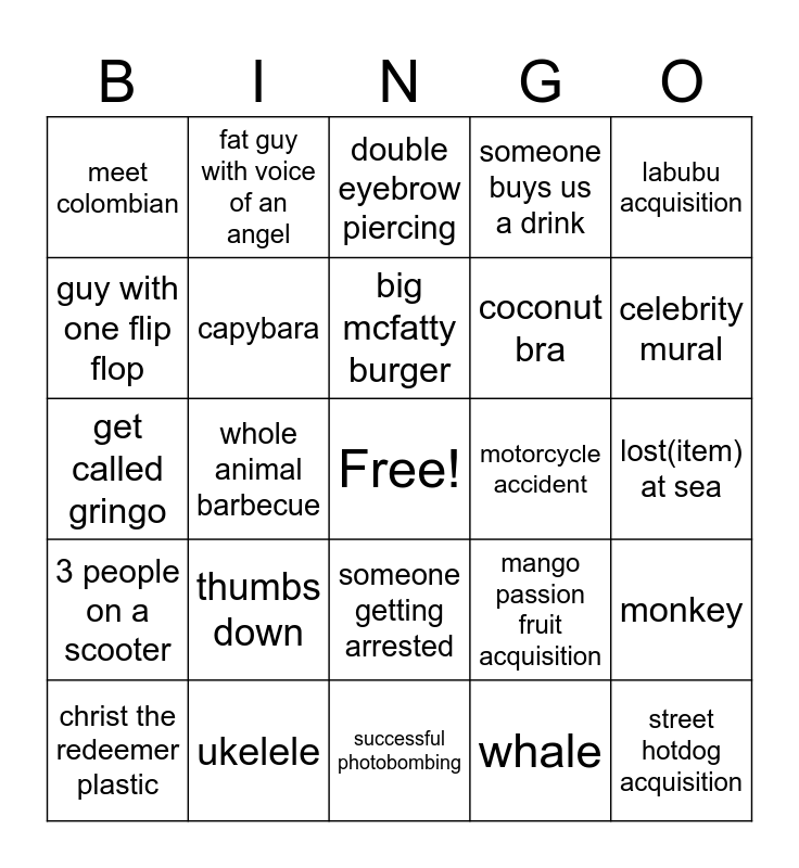 This bingo card has a free space and 24 words: thumbs down, ukelele, big mcfatty burger, christ the redeemer plastic, labubu acquisition, meet colombian, guy with one flip flop, fat guy with voice of an angel, motorcycle accident, someone getting arrested, coconut bra, get called gringo, mango passion fruit acquisition, monkey, capybara, whale, lost(item) at sea, double eyebrow piercing, celebrity mural, whole animal barbecue, street hotdog acquisition, 3 people on a scooter, someone buys us a drink and successful photobombing.