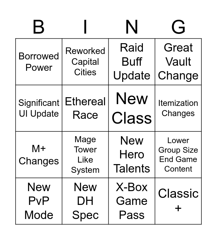 This bingo card has 16 words: New DH Spec, Lower Group Size End Game Content, Raid Buff Update, Borrowed Power, M+ Changes, Reworked Capital Cities, New Hero Talents, X-Box Game Pass, Significant UI Update, Ethereal Race, New PvP Mode, Great Vault Change, Mage Tower Like System, Itemization Changes, New Class and Classic +.