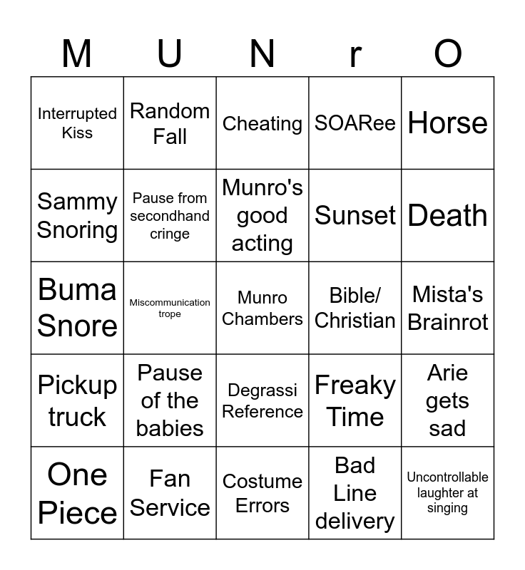 This bingo card has a free space and 38 words: Bad Singing, Bad Acting, Bad Joke, Pause from secondhand cringe, Arie gets sad, Pause of the babies, Munro's good acting, Arie goons, Horse, Sunset, Miscommunication trope, SOARee, Uncontrollable laughter at singing, Mista's Brainrot, Sammy Snoring, Pickup truck, Munro's Bad Acting, Cheating, Guns, Bible/ Christian, Interrupted Kiss, Fan Service, Death, One Piece, Bad dancing, Costume Errors, Bad Southern Accent, Evil City Boyfriend, Product Placement, Front Porch scene, Raining Scene, Degrassi Reference, Bad Line delivery, Random Fall, Coffee, Freaky Time, Buma Snore and Axel Joins.