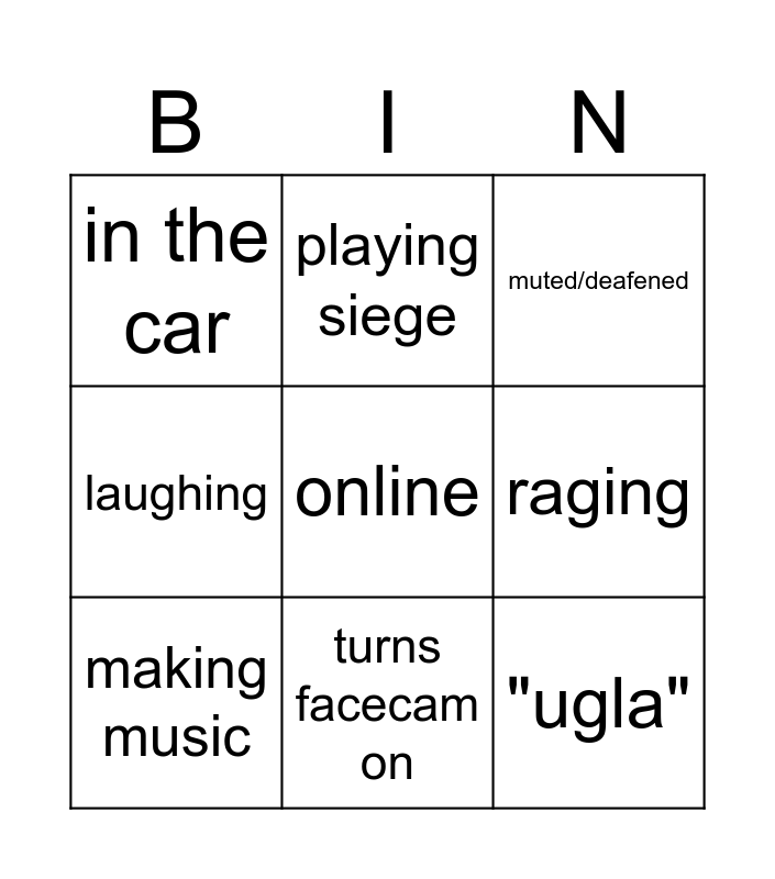 This bingo card has a free space and 8 words: raging, muted/deafened, playing siege, making music, in the car, "ugla", laughing and turns facecam on.