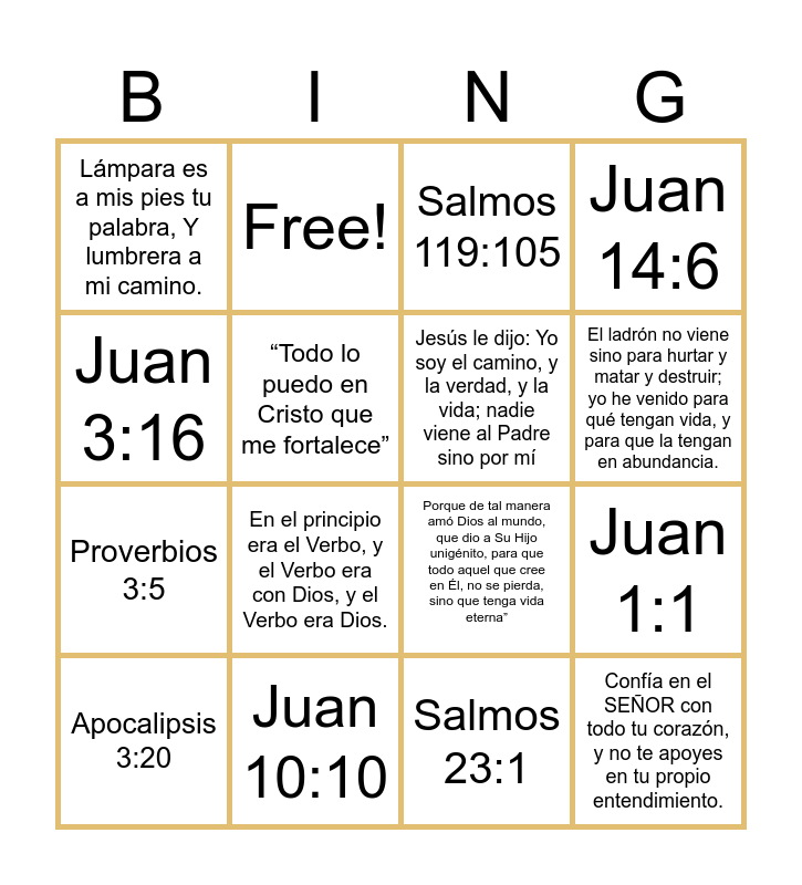 This bingo card has 19 words: Porque de tal manera amó Dios al mundo, que dio a Su Hijo unigénito, para que todo aquel que cree en Él, no se pierda, sino que tenga vida eterna”, El señor es mi pastor nada me faltara, Salmos 119:105, Confía en el SEÑOR con todo tu corazón, y no te apoyes en tu propio entendimiento., Juan 1:1, Juan 3:16, Salmos 23:1, Lámpara es a mis pies tu palabra, Y lumbrera a mi camino., Free!, Proverbios 3:5, En el principio era el Verbo, y el Verbo era con Dios, y el Verbo era Dios., “Todo lo puedo en Cristo que me fortalece”, Jesús le dijo: Yo soy el camino, y la verdad, y la vida; nadie viene al Padre sino por mí, Juan 10:10, Apocalipsis 3:20, Filipenses 4:13, Juan 14:6, El ladrón no viene sino para hurtar y matar y destruir; yo he venido para qué tengan vida, y para que la tengan en abundancia. and He aquí, yo estoy a la puerta y llamo; si alguno oye mi voz y abre la puerta, entraré a él, y cenaré con él, y él conmigo.