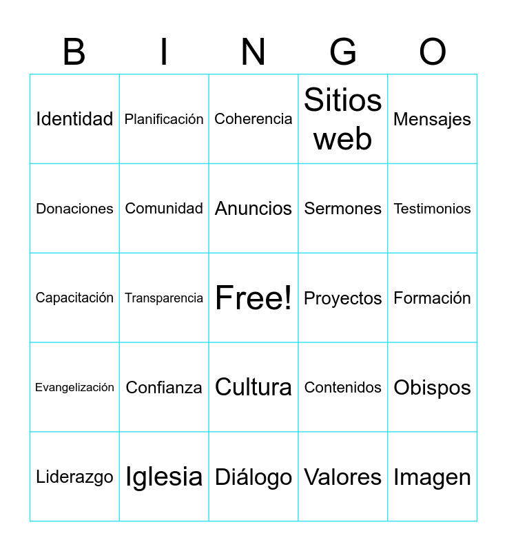 This bingo card has a free space and 60 words: Comunicación, Iglesia, Estrategia, Evangelización, Valores, Participación, Comunidad, Redes sociales, Sermones, Boletines, Sitios web, Voluntarios, Donaciones, Reflexiones, Misión, Identidad, Imagen, Mensajes, Públicos, Anuncios, Proyectos, Coherencia, Liderazgo, Obispos, Sacerdotes, Pastoral, Creatividad, Profesionalismo, Testimonios, Relaciones, Medios, Prensa, Canales, Objetivos, Planificación, Evaluación, Relevancia, Transparencia, Recursos, Capacitación, Mentalidad, Confianza, Formación, Coordinación, Contenidos, Audiencia, Adaptación, Sintonía, Resultados, Cultura, Diálogo, Espiritualidad, Comunicación interna, Comunicación externa, Llamados, Publicaciones, Creatividad, Iniciativa, Trabajo en equipo and Visión compartida.