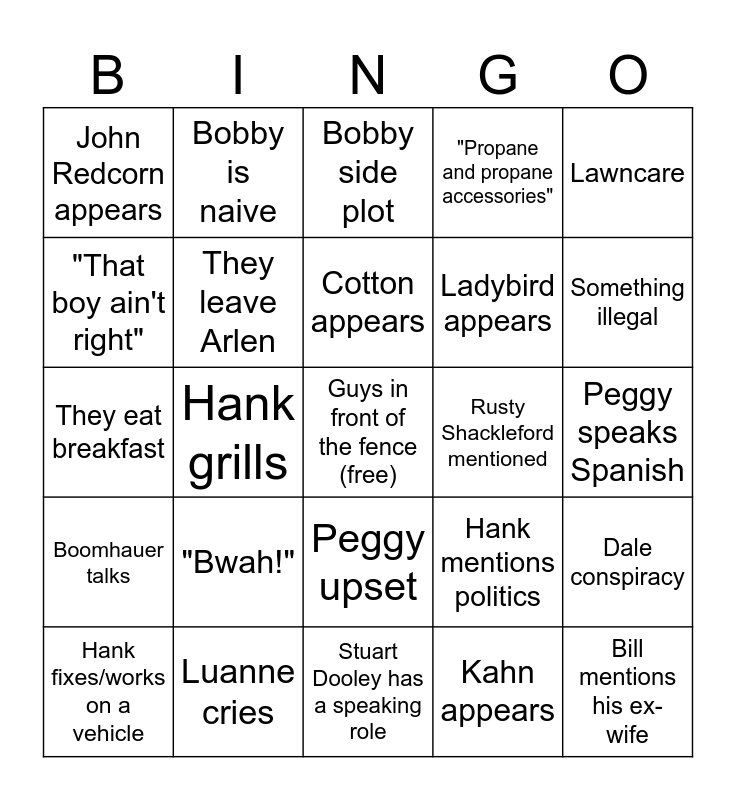 This bingo card has a free space and 24 words: "Bwah!", Luanne cries, Cotton appears, Hank fixes/works on a vehicle, Lawncare, John Redcorn appears, "That boy ain't right", Bobby is naive, Rusty Shackleford mentioned, Peggy upset, Ladybird appears, They eat breakfast, Hank mentions politics, Dale conspiracy, They leave Arlen, Kahn appears, Peggy speaks Spanish, Bobby side plot, Something illegal, Hank grills, Bill mentions his ex-wife, Boomhauer talks, "Propane and propane accessories" and Stuart Dooley has a speaking role.