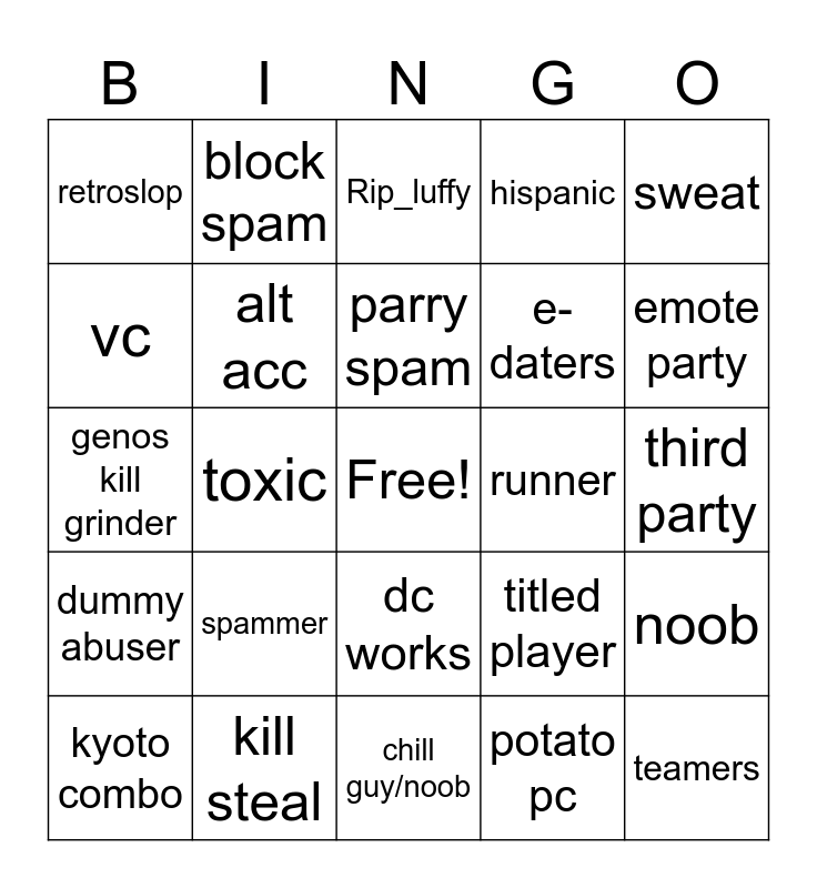 This bingo card has a free space and 29 words: kyoto combo, emoted on, toxic, furry, retroslop, Rip_luffy, alt acc, spammer, runner, kill steal, third party, teamers, chill guy/noob, potato pc, emote party, cosmetic spammer, dc works, dummy abuser, sweat, genos kill grinder, titled player, gooner avatar, e-daters, vc, hispanic, block spam, noob, parry spam and L emote.
