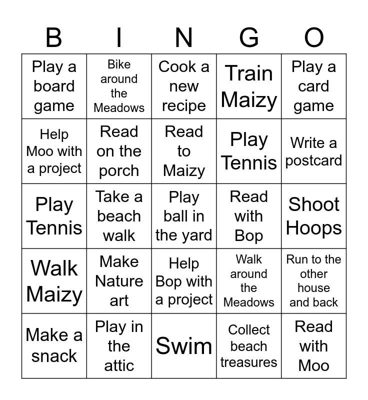 This bingo card has 25 words: Walk Maizy, Play in the attic, Play ball in the yard, Collect beach treasures, Play a card game, Play a board game, Bike around the Meadows, Cook a new recipe, Read with Bop, Run to the other house and back, Help Moo with a project, Read on the porch, Swim, Walk around the Meadows, Write a postcard, Make a snack, Take a beach walk, Read to Maizy, Play Tennis, Shoot Hoops, Play Tennis, Make Nature art, Help Bop with a project, Train Maizy and Read with Moo.