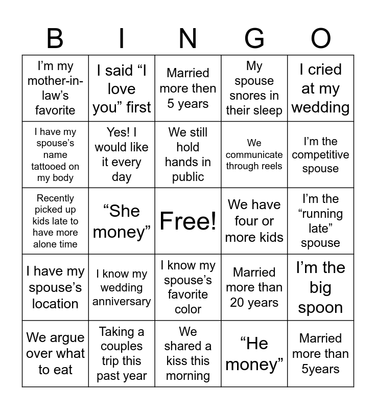 This bingo card has a free space and 25 words: I know my wedding anniversary, We shared a kiss this morning, We still hold hands in public, We argue over what to eat, I cried at my wedding, I’m my mother-in-law’s favorite, I have my spouse’s name tattooed on my body, I said “I love you” first, We have four or more kids, I know my spouse’s favorite color, We communicate through reels, Recently picked up kids late to have more alone time, Married more than 20 years, I’m the big spoon, Yes! I would like it every day, I hide Amazon packages, I’m the “running late” spouse, Married more then 5 years, I’m the competitive spouse, “She money”, Married more than 5years, Taking a couples trip this past year, I have my spouse’s location, My spouse snores in their sleep and “He money”.