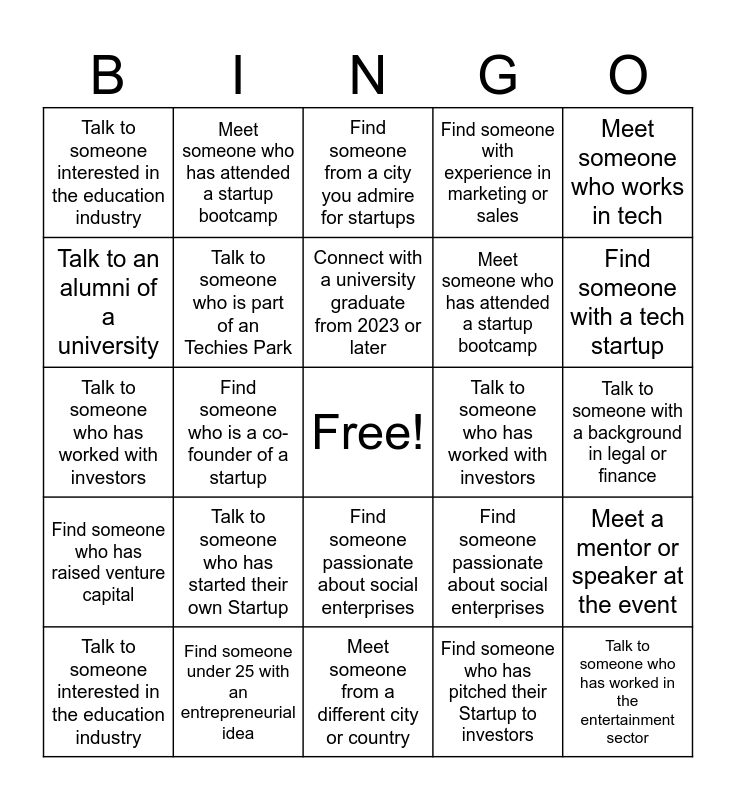 This bingo card has a free space and 24 words: Talk to someone who has started their own Startup, Find someone under 25 with an entrepreneurial idea, Connect with a university graduate from 2023 or later, Talk to someone interested in the education industry, Meet someone who works in tech, Talk to someone interested in the education industry, Talk to an alumni of a university, Meet someone who has attended a startup bootcamp, Talk to someone who has worked with investors, Find someone passionate about social enterprises, Meet someone who has attended a startup bootcamp, Talk to someone who has worked with investors, Find someone passionate about social enterprises, Meet a mentor or speaker at the event, Talk to someone who is part of an Techies Park, Find someone who has pitched their Startup to investors, Talk to someone with a background in legal or finance, Find someone from a city you admire for startups, Find someone with a tech startup, Find someone who is a co-founder of a startup, Talk to someone who has worked in the entertainment sector, Find someone who has raised venture capital, Find someone with experience in marketing or sales and Meet someone from a different city or country.