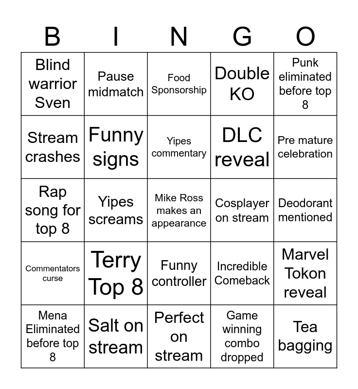This bingo card has a free space and 24 words: Terry Top 8, Salt on stream, Yipes commentary, Mena Eliminated before top 8, Punk eliminated before top 8, Blind warrior Sven, Stream crashes, Pause midmatch, Cosplayer on stream, Funny controller, DLC reveal, Rap song for top 8, Incredible Comeback, Marvel Tokon reveal, Funny signs, Game winning combo dropped, Deodorant mentioned, Food Sponsorship, Pre mature celebration, Yipes screams, Tea bagging, Commentators curse, Double KO and Perfect on stream.