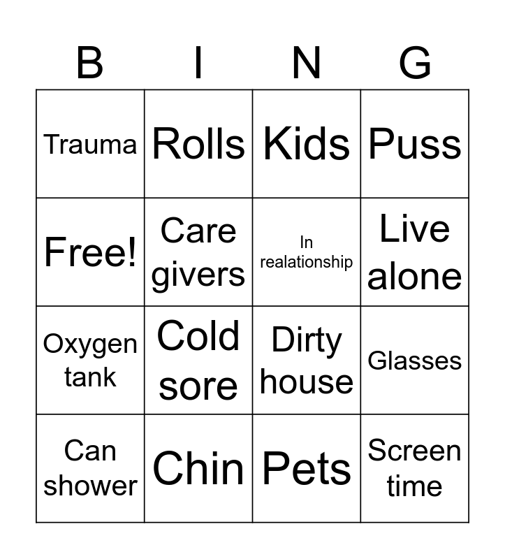 This bingo card has 16 words: Chin, Glasses, Kids, Trauma, Oxygen tank, Rolls, Dirty house, Pets, Free!, Care givers, Can shower, Puss, Cold sore, Live alone, In realationship and Screen time.